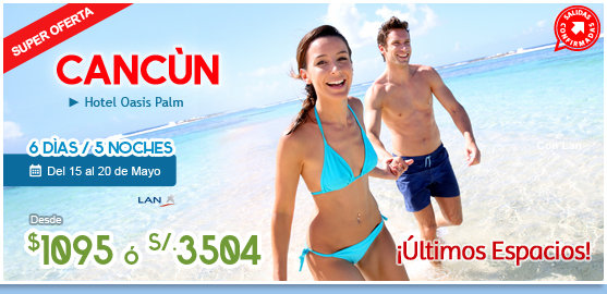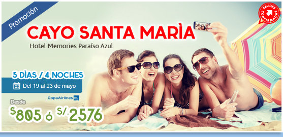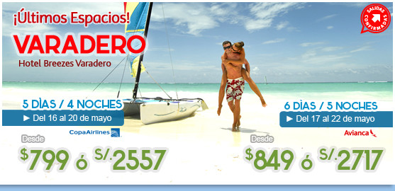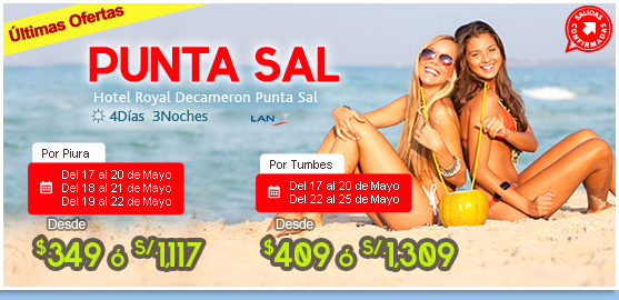 Punta Sal Decameron Pasajes aéreos, 3 noches de alojamientoTodo Incluido en Hotel Decameron Punta Sal. Desde $429 ó S/.1,373 Paquete a Punta CanaPasajes aéreos, 5 noches Todo incluido, alojamiento en Hotel Todo Incluido. Desde $769 ó S/.2,461 Paquete Cancún Pasajes aéreos, 4 noches Todo Incluido, alojamiento.Desde $989 ó S/.3,165 Paquete VaraderoIncluye: Pasajes aéreos, Lima - La Habana - Lima, Desde 4 noches todo incluido.Desde $809 ó S/.2,589 Paquete Cayo Santa MaríaIncluye: Pasajes aéreos, 4 noches todo incluido.Desde S $885 ó S/.2,832 Paquete Riviera MayaIncluye: Pasajes aéreos, 4 noches de alojamiento.$ 979 ó S/. 3,133 Paquete Puerto AventurasIncluye: Pasajes aéreos, 4 noches de alojamiento.$ 905 ó S/.2,896 Fiestas Patrias Punta Cana Pasajes aéreos, 4 noches de alojamiento Incluye pasajes aéreos. Todo Incluido en Hotel. Desde $1,185 ó S/.3,792 Fiestas Patrias Cancún Pasajes aéreos, 4 noches de alojamiento Incluye pasajes aéreos. Todo Incluido en Hotel. Desde $1,189 ó S/.3,805 Fiestas Patrias Varadero Pasajes aéreos, 4 noches de alojamiento Incluye pasajes aéreos. Todo Incluido en Hotel. Desde $989 ó S/.3,165 Paquete Fiesta de SolterosIncluye: Pasajes aéreos, Lima - La Habana - Lima, Desde 6 noches todo incluido.Desde $1199